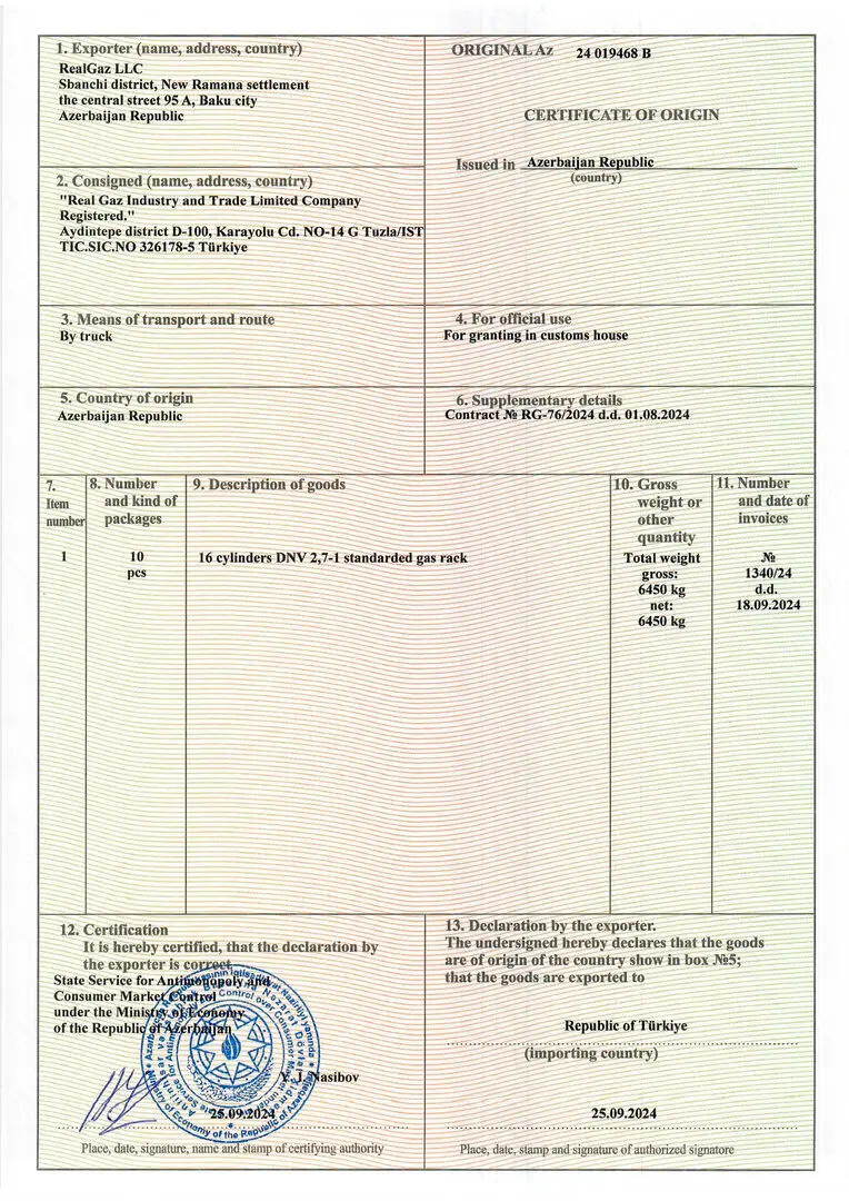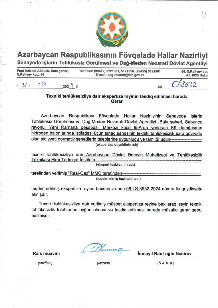 RealGaz, Azerbaycan Fövqəladə Hallar Nazirliyi tarafından tüm silindir tiplerinin hidrostatik testlərini gerçekleştirme konusunda resmi yetki sahibidir. Bu yetki, ekipman güvenliğini belgelendirme və rəsmi sənədlərlə təmin etmə imkanı verərək bizi bölgə bazarında fərqləndirən əsas üstünlüklərdən biridir.