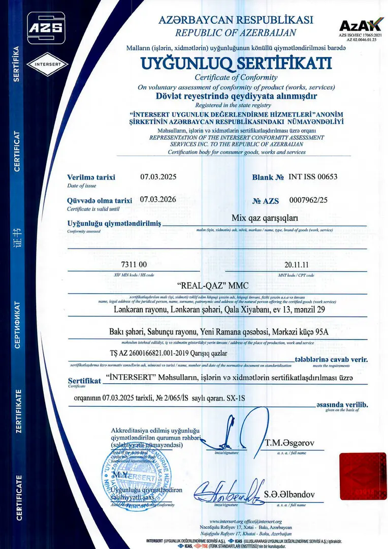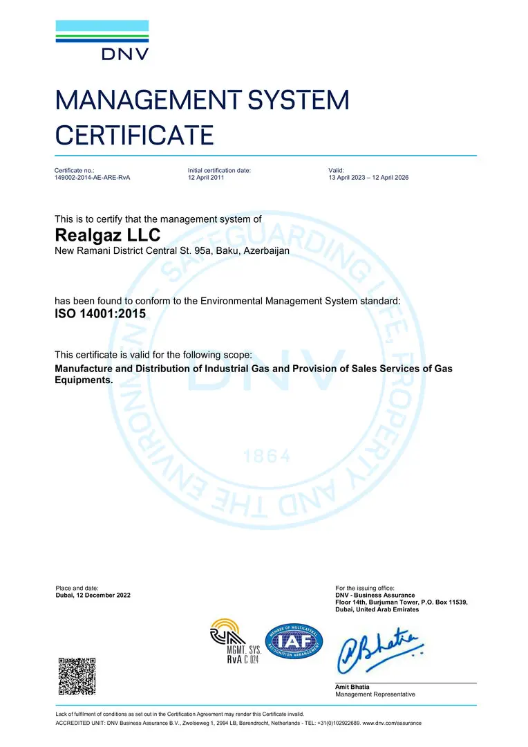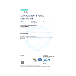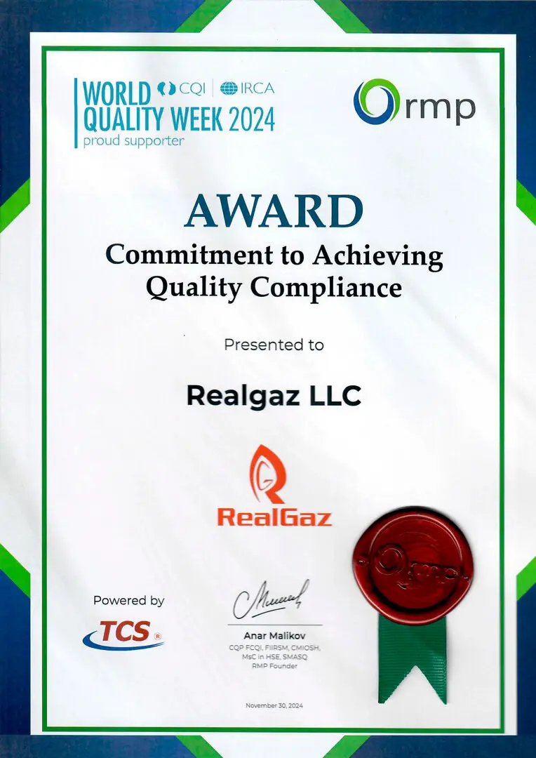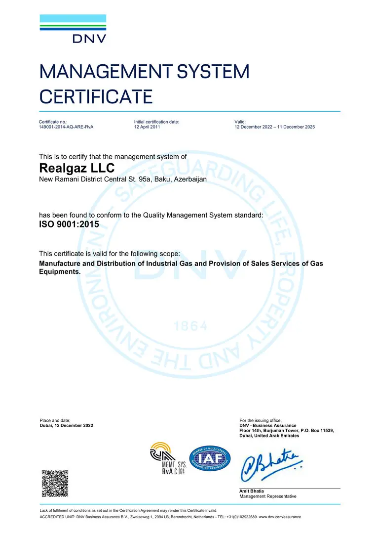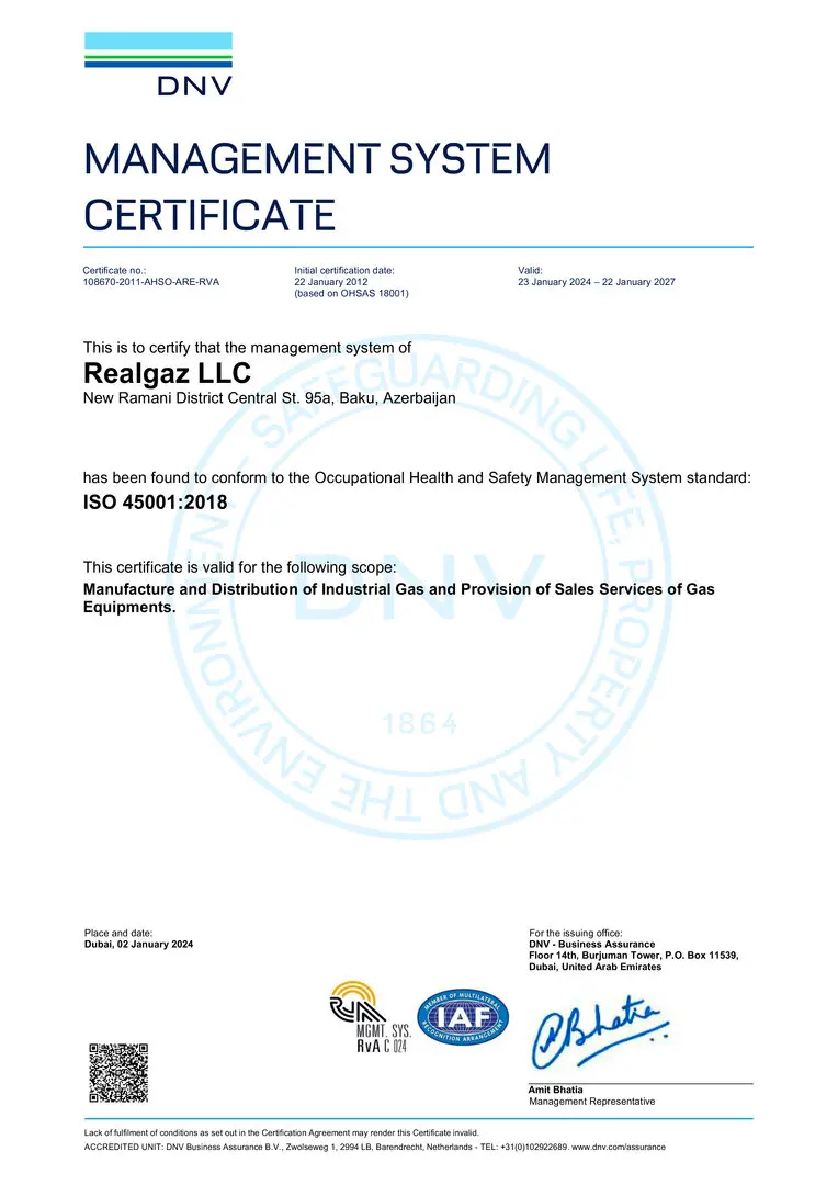 RealGaz, teknik gazlar sektöründe Azerbaycan’da ISO 9001:2000 sertifikasını alan ilk şirket olmuştur. Bu sertifika, 7 Aralık 2005’te OHSAS 18001:2007 sertifikası ile birlikte verilmiştir. Mükemmeliyete olan bu öncü bağlılık, bizi bölgenin kalite lideri olarak tanıtmıştır.