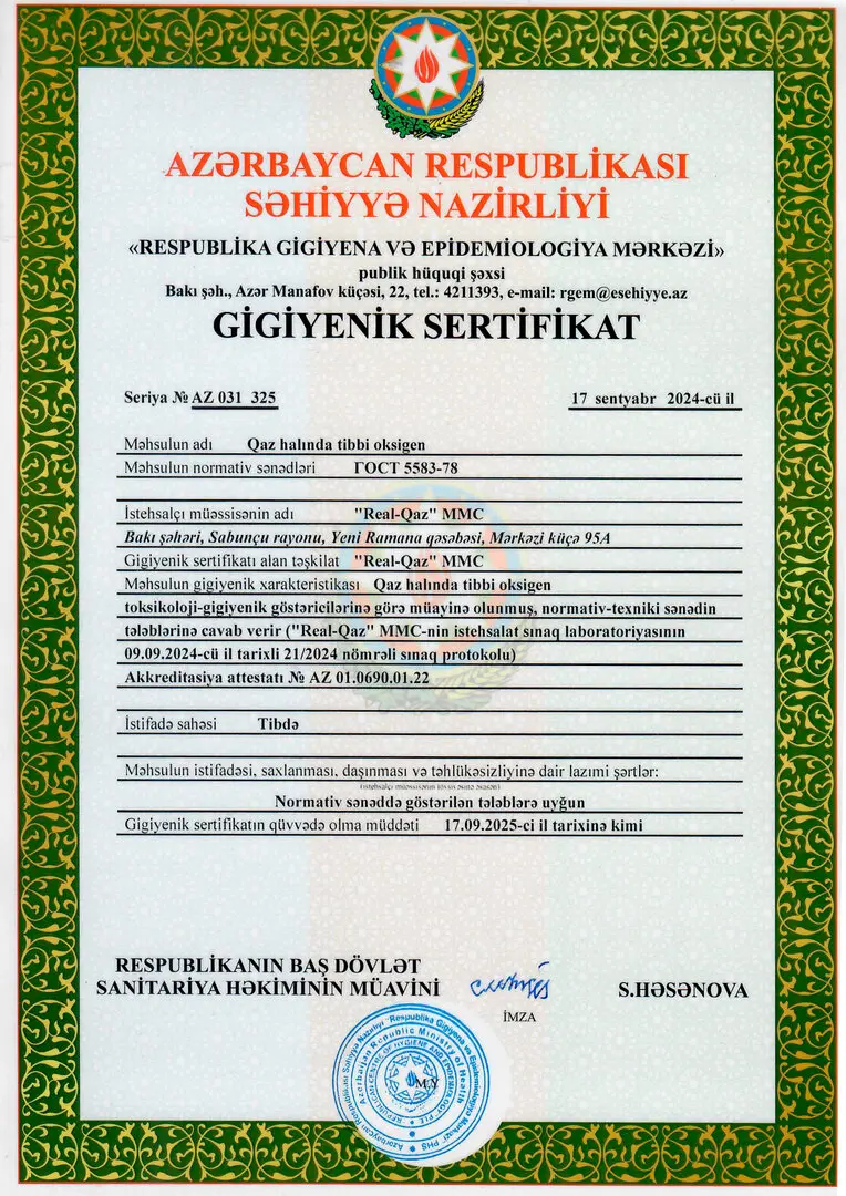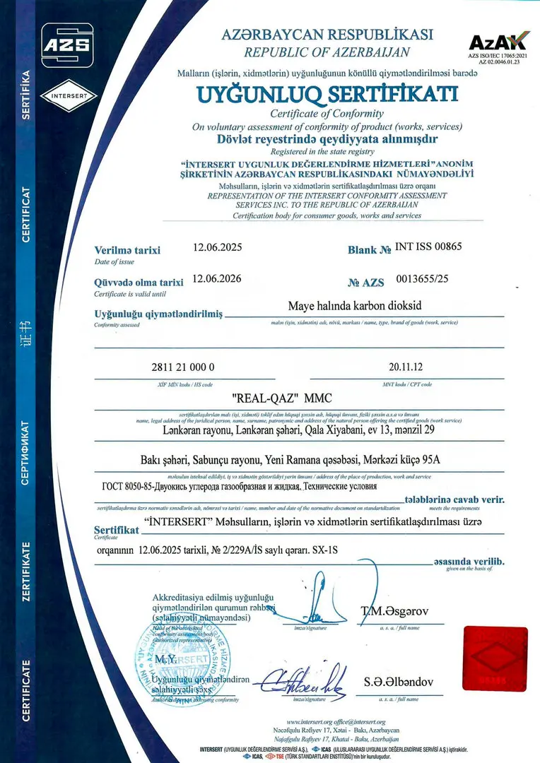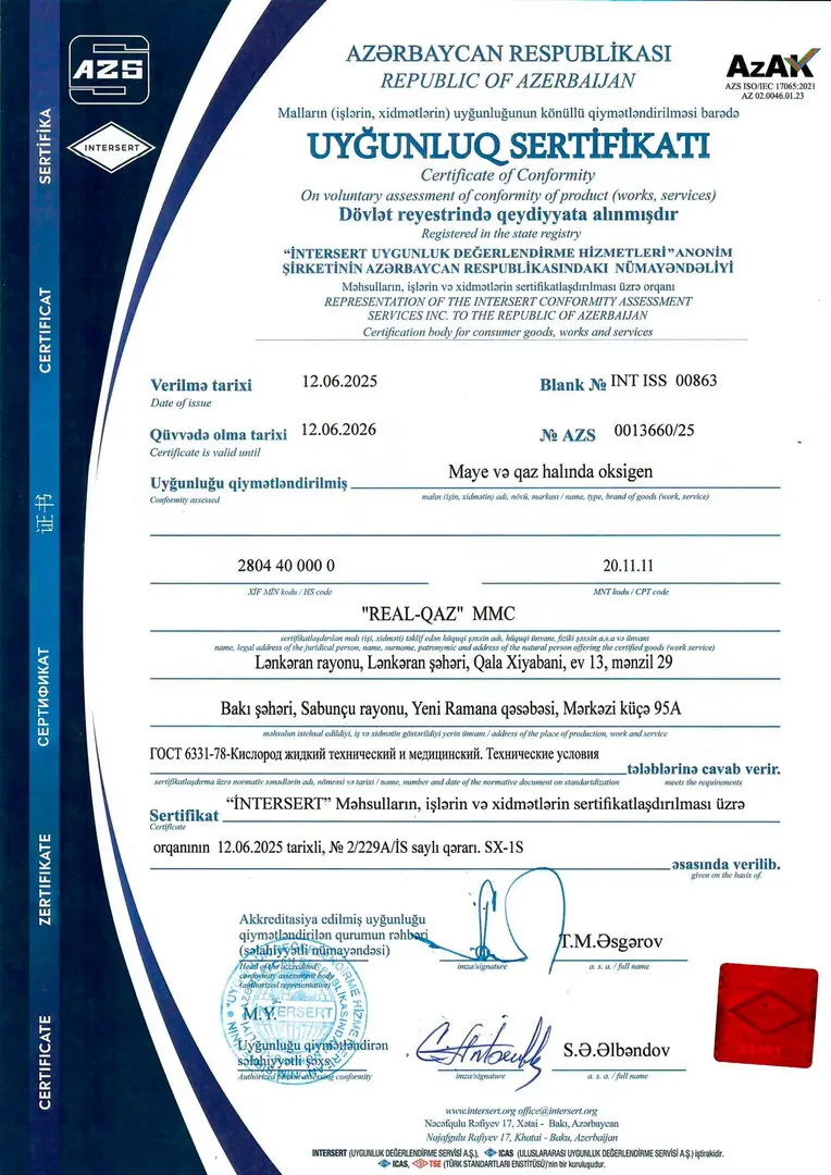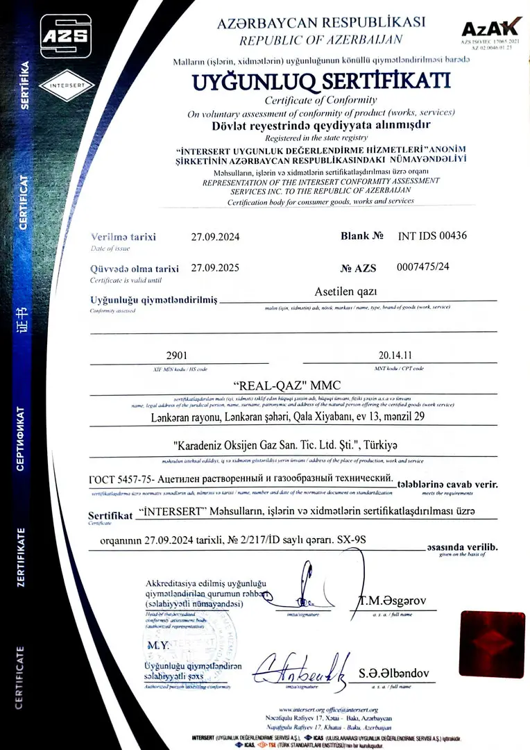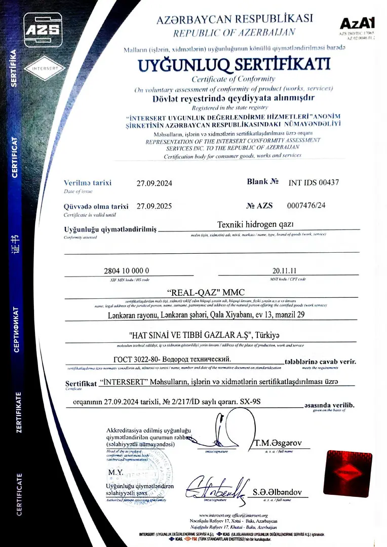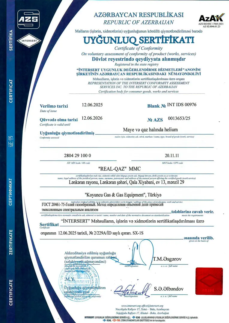 RealGaz, teknik gazlar sektöründe Azerbaycan’da ISO 9001:2000 sertifikasını alan ilk şirket olmuştur. Bu sertifika, 7 Aralık 2005’te OHSAS 18001:2007 sertifikası ile birlikte verilmiştir. Mükemmeliyete olan bu öncü bağlılık, bizi bölgenin kalite lideri olarak tanıtmıştır.